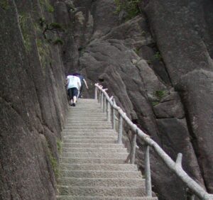 Next up is a short trek to the tallest peak of the Yellow Mountain range. Lianhua Feng (Lotus Peak) is 6,115 feet (1,864 m), just a hair taller than Bright Peak. At 7:45 a.m., we take a break, and enjoy some coconut juice and chocolate. Up to the present time, we have always been climbing higher.