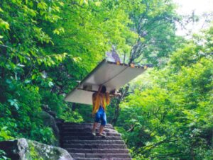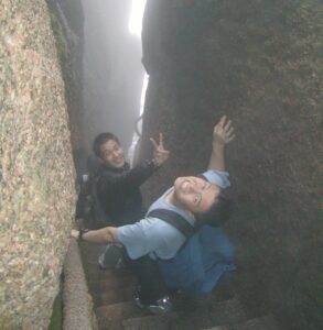 Fortunately, shade covers most of the trail, so it’s cool for the most part. But it’s very easy to overheat when the sun is out. Everyone starts out strong, but near the top, you need a break after every few steps. On the other hand, Zheng Zhen is having no problems. He is bounding up and away with ease.