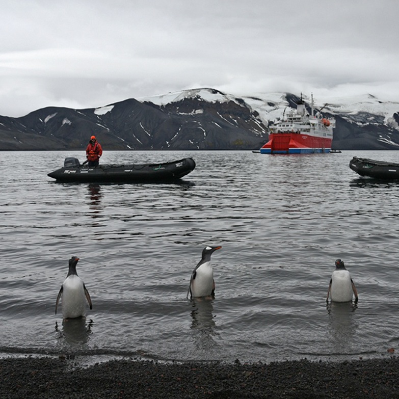 Zodiac boats ferry you to the Antarctic shore where you go on hikes, see penguin colonies, & explore research bases