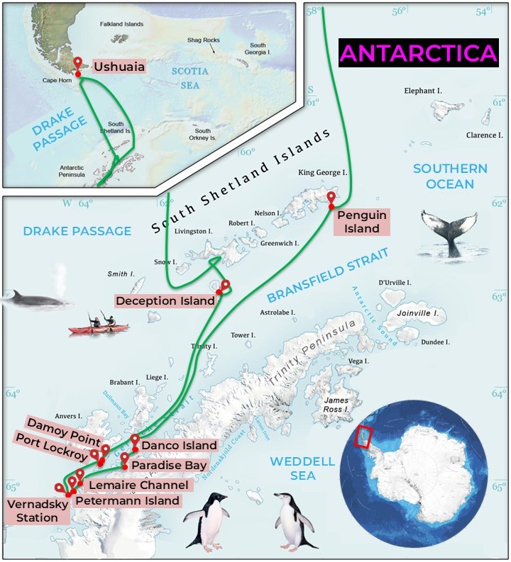Penguin Island’s pebble beach contains whale skeletons and a penguin highway. Hike on the red volcanic rocks of Deacon Peak. From the crater, you can view Bransfield Strait to the south and King George Bay to the north.