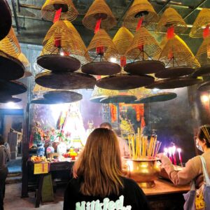 The round green tiles on the low-slung building are a stark contrast to the modern skyscrapers rising behind the temple. Dozens of incense coils hang from the ceiling and slowly burn carrying prayers to the heavens.