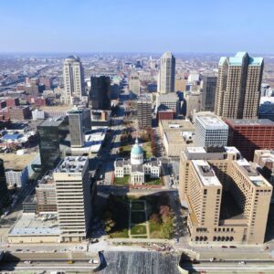 From the observation windows, you have panoramic birds-eye views of STL. To the west, you see St. Louis, the Old Courthouse, with Missouri beyond the horizon. To the east, observe the Mississippi River, East St. Louis, and Illinois.