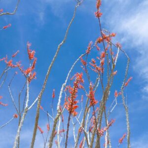 At the Ocotillo Patch, these desert plants bloom during spring. From spiky thorny stalks, red flowers bloom and fall off practically overnight to conserve moisture.