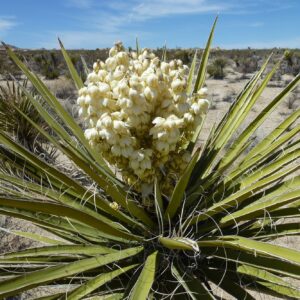 The ivory flowers of the Joshua tree only bloom under certain conditions, after a recent rainstorm or winter freeze. Some Joshua trees have no branches because they have never bloomed.