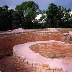 The third largest cliff dwelling is located in a natural alcove. With 130 rooms and 8 kivas, 60 to 80 people could live comfortably. Ranchers found this site below a sandstone arch by climbing down a Douglas Fir tree.