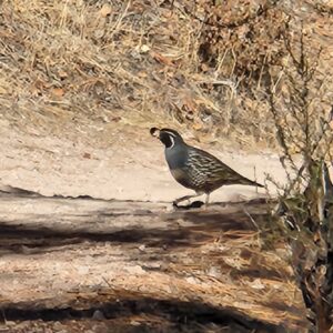 Quail have a topknot of six feathers that droop forward. A group of quail is a covey. Quail prefer moving around on foot, but when startled, they will burst into flight, called “flushing”.