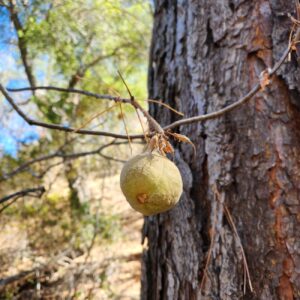 The California Buckeye’s big round seeds have a light gray husk. Indigenous groups used the poisonous seeds to stun schools of fish for easy pickings. They also boiled the toxins away and ground the buckeyes into a flour.