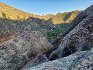 From the Bear Gulch parking lot, the trail rises gently above Condor Gulch Road. After the road ends, the trail turns and hugs the canyon wall. At about 0.6 miles from the ranger station, the trail turns into what I presume is Condor Gulch. During this final stretch, you’ll have the best views of the High Peaks area above and to the west. At just under the one-mile point, take the spur to the overlook. From the viewpoint, there’s a nice view of the gulch below and the jagged rock formations in every direction. If you’re hoping to see condors, your best bet is to do the High Peaks Trail. At this point, you can return to Bear Gulch or complete the trail and link up with High Peaks Trail.