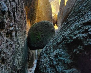 Right before the cave entrance, the towering Balconies rock formation suddenly appears. Once you pass through the gate, you’ll need to have your headlamp ready. Some serious spelunking is about to begin at the Balconies Cave. It quickly becomes pitch dark. There’s some light scrambling through the narrow passage. Shine your light on the smooth rock to ensure proper footing. When you look up, you’ll see some rays of light poking through the roof. One of the dark crevices has a fluttering bat.