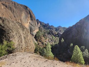 After exiting Balconies Cave, the trail soon connects with Balconies Cliff Trail. The turnaround spot for the Balconies Trail loop is just before the bridge. At this point, another ranger praised my hand-drawn map, which I made because the park wasn’t providing maps during the government shutdown. A few switchbacks rise almost 200 feet in 0.2 miles. From the top of the cliff, you have great views of the Balconies and Machete Ridge. Pinnacles form a crown on the ridgeline. Most of them look like jagged teeth.